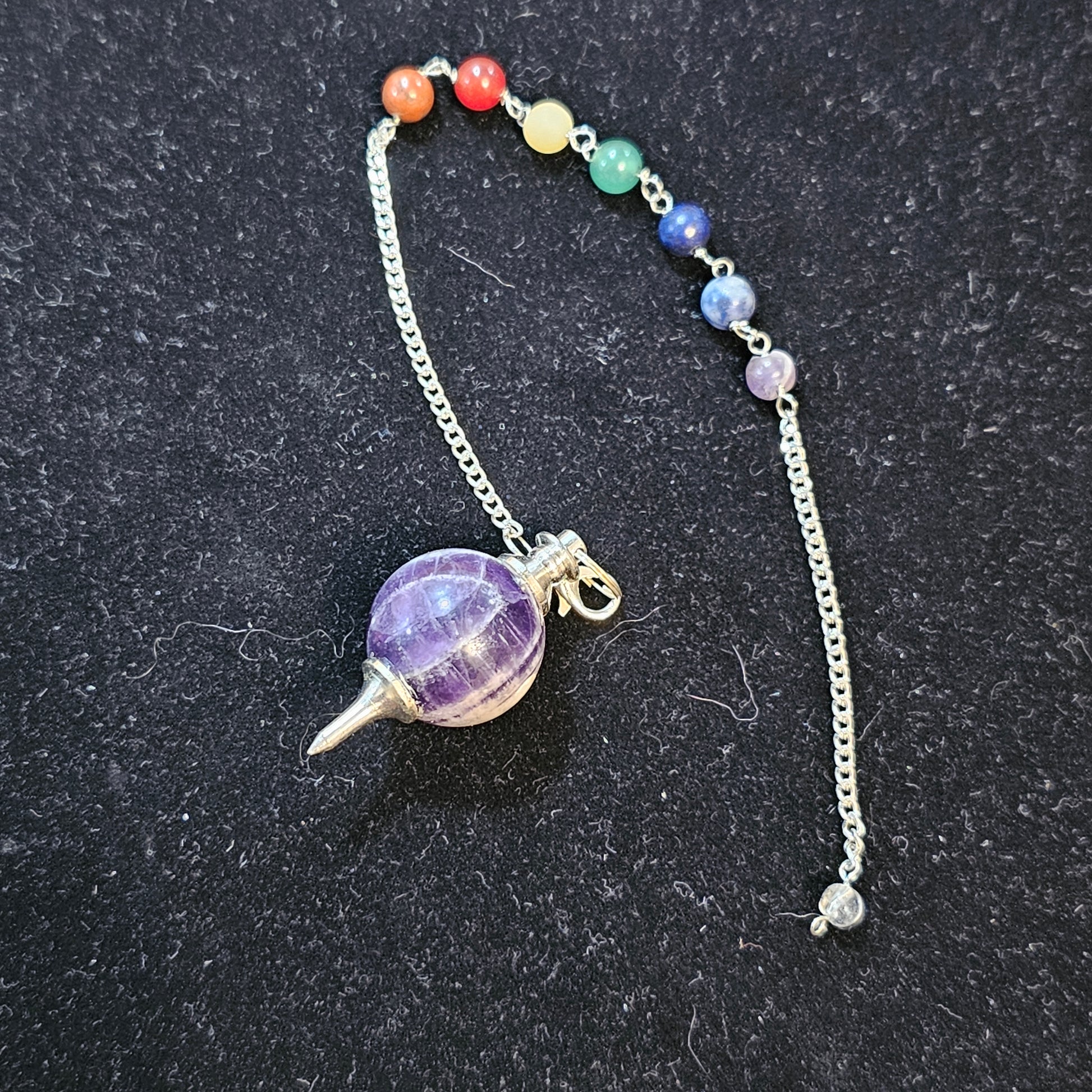 A nicely weighted pendulum with amethyst sphere at the bottom and Chakra colours on the chain